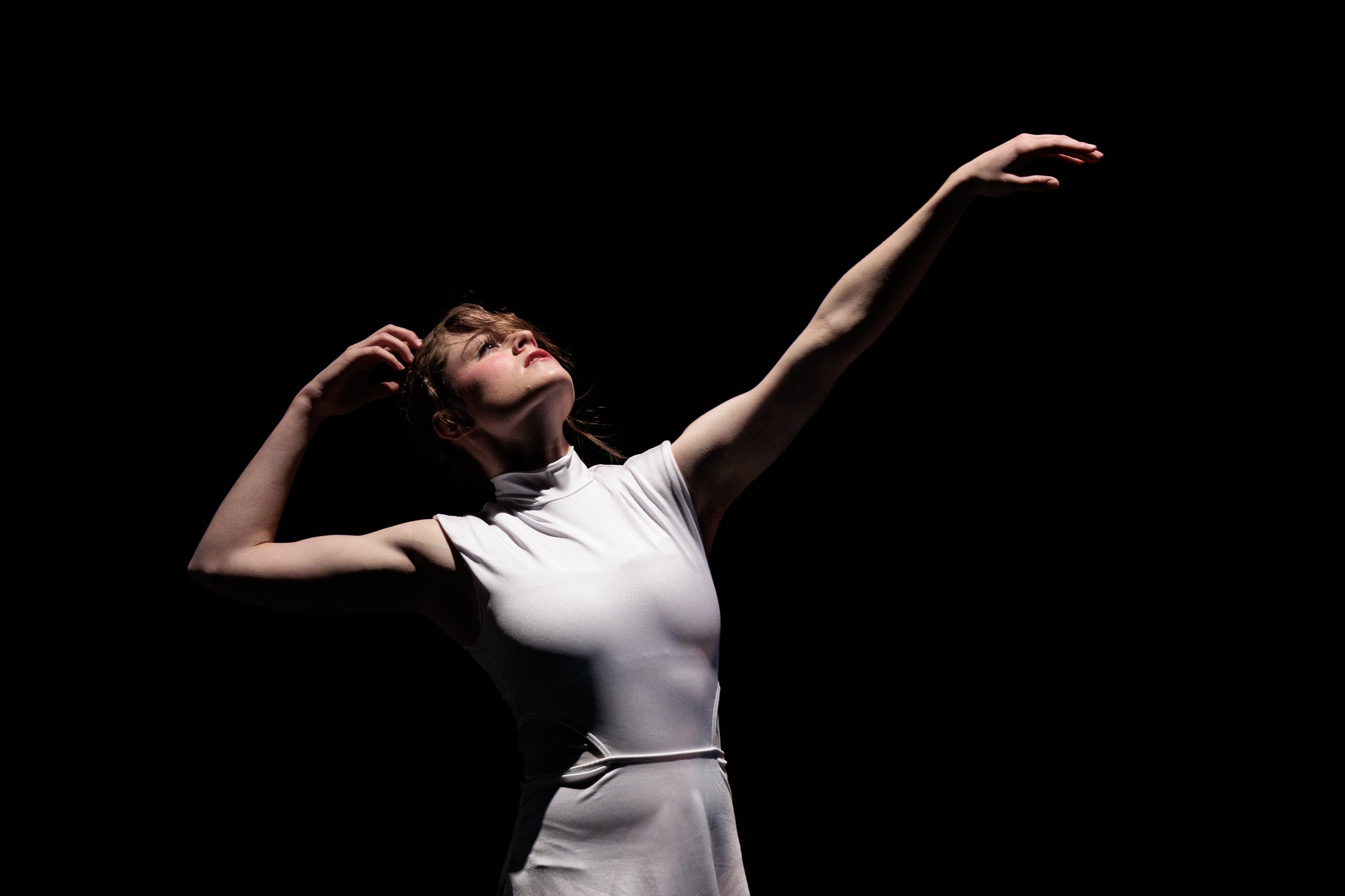The solo was a delightful contrast, as the full band electronic music gives way to a solo piano and voice. Clad in white, the single dancer and I developed a unique vocabulary and pathway through space that illustrated her “clinging to the edge”. There are sustained moments of surrender and reach through space, accented by repetitive patterns and energies that seem to envelop her in movement.